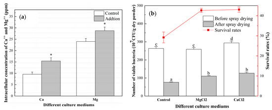 Intracellular Ca++ and Mg++ concentrations and survival rate. (a) Intracellular Ca++ and Mg++ concentrations. p < 0.05: *. (b) Spray-drying survival rate after supplementation with CaCl2 and MgCl2. p < 0.05: differences between groups indicated by a, b, c and d.