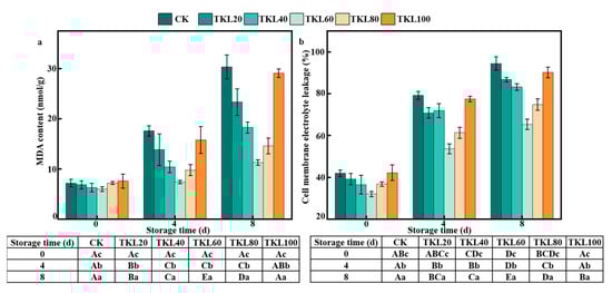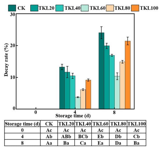 TKL composite membrane fluids could reduce the decay rate of blueberry during storage at room temperature (Figure 1). The decay rate of the control group was more than 10% on the fourth day of storage; there was no significant difference in decay rate between TKL20 and TKL40 groups and CK group. On the eighth day of storage, the fruits of all groups showed different degrees of decay, and the TKL60 group had the least decayed fruit and the lowest decay rate (10.33%). Interestingly, there was no significant difference in fruit decay rate between TKL100 and TKL20 at the end of storage. This may be explained by the fact that thymol is a natural compound exhibiting phytotoxic activity [32]. TKL60 group had the lowest decay rate during the whole storage period, indicating that 60 mg/L thymol could effectively inhibit fruit decay.