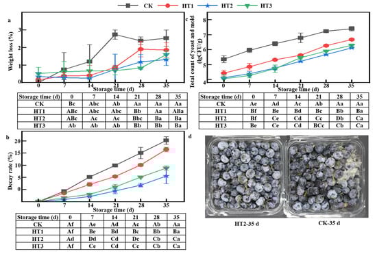We evaluated the decay rate, MDA content, and REC in blueberries, 0 d, 4 d, and 8 d after treatment with HT during simulated marketing at 25 °C. The sampling methods were conducted using a completely randomized design, with three replicates per treatment.