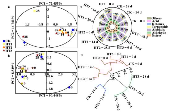 E-nose and E-tongue (FOX 4000 Alpha MOS, Toulouse, France) analysis was conducted. Blueberry fruits (20.0 g per group) were homogenized in 80 mL of 80% deionized water. Each treatment was repeated seven times. Samples of 2 g of blueberry juice were collected in headspace vials at 60 °C for 5 min, and then evaluated by electronic nose. The E-nose measurement parameters were as follows: sensor cleaning time of 180 s, injection time of 3 s, gas flow rate of 150 mL/min, and data collection time of 120 s. Blueberry juice samples (20 mL) were diluted 5-fold with 80 mL of deionized water and used to measure fruit taste using an E- tongue autosampler tray for the measurement sequence.