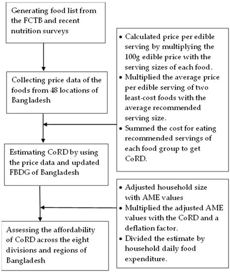Figure 1 presents the overall methodology we followed. Calculating the CoRD required a list of food items that are frequently consumed and available in the food markets throughout Bangladesh. Foods listed in the Food Composition Table for Bangladesh (FCTB) were used as our initial food list, as it contains 386 Bangladeshi food items with their nutrient composition [,]. Later, to reflect the current consumption pattern, the food list was updated based on recent nutrition-related surveys, namely the Bangladesh Integrated Household Survey, 2015 (BIHS, 2015), Institute of Nutrition and Food Science Survey, 2017–2018 (INFS, 2017–2018), and Household Income and Expenditure Survey, 2016 (HIES, 2016). Subsequently, a comprehensive food list containing 124 food items was finalized. The food items were then categorized into nine food groups by separating leafy and non-leafy vegetables into distinct groups. To address the regional variation of food availability across 8 divisions of Bangladesh, food items exclusively available to regional markets were incorporated into the regional food list while calculating the CoRD of that respective division.