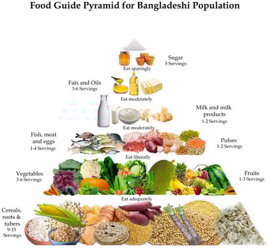 In a joint initiative by the Food Planning and Monitoring Unit (FPMU), the Ministry of Food, and the Ministry of Health and Family Welfare of the Government of Bangladesh (GoB), the older 2013 version of FBDG was updated in 2020. This updated FBDG (Figure 2), which provides more quantitative information and specific serving recommendations (Table 1), was used in this study.