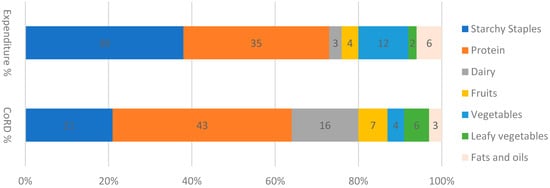 One of the major findings of this study was that among all the food groups, staples possessed the largest share of household expenditure (38%). The households significantly underspent on protein-rich animal-source foods, fruits, leafy vegetables and dairy products, whereas they spent 180% and 200% more on cereals and oils, respectively. The most likely explanation behind this is the drastic rise in the cost of diet when protein-rich animal-source foods (meat, fish, and eggs) and dairy are added to the food basket compared to cereals, pulses, and oil. The implication is that it is costlier to meet the recommendations for dairy and protein-rich animal-source foods, and thus households choose to under-consume them. The high prices of these food groups are also observed in literature of South Asia, where they presented animal foods and dairy products as the costliest food groups and less affordable ones [,,,]. According to the State of Food Security and Nutrition in the World report (SOFI), low productivity, lack of fair-trade policies, inefficient supply chains, and insufficient local storage capacities are the critical factors to rocketing the prices of nutritious foods [].