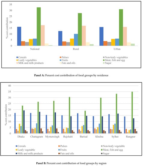 Figure 4 represents the cost contribution of each food group according to FBDG in comprising the total cost of a recommended diet. To the total cost, “meat, fish and egg” and “milk and milk products” contribute the major share nationally and in urban and rural areas. This means that to meet the FBDG of Bangladesh, an individual would need to spend more on meat, fish, and egg, along with milk and milk products. The cost of meeting the recommended number of servings of all food groups except leafy vegetables, sugar, and fruits was higher in rural areas than in urban areas (Figure 4, Panel A).