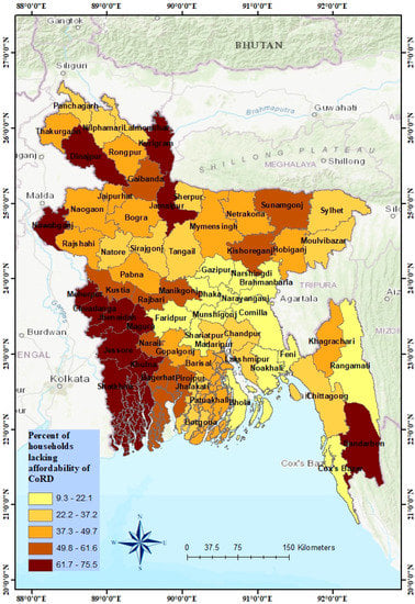 Likewise, in administrative units and residences, the affordability also altered with geographical locations. Figure 5 shows the percentage of households unable to afford the CoRD in 64 districts of Bangladesh. The percentage of households lacking affordability was divided into five categories ranging from 9.3% to 75.5%. As the percentage of households unable to afford the CoRD increased, the color of the areas got darker. This indicates that the geographical areas with the darkest color were the districts where the freight of unaffordability was the highest. The Choropleth map shows that unaffordability was the highest in the Southwest part, followed by the Northwest part of Bangladesh.