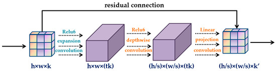 An important means in improving the efficiency of the model is to design a more efficient lightweight network model without affecting the efficiency of model. At present, researchers have proposed various lightweight convolutional neural networks. ShuffleNet uses pointwise group convolution to reduce computing loss. The channels of each part of the feature map are shuffled by channel shuffle to form a new feature map. Ghostnet transforms a group of internal feature mappings into ghost feature mappings through the application of another linear transformation, which reflects the change information of internal features. The Mobilenet series network is a lightweight convolutional neural network with deep separable convolutions as the core. The deep separable convolution decomposes the standard convolution into two steps: the deep convolution and the pointwise convolution. Deep convolution first uses different convolution kernels to process multi-layer channels before using 1 × 1 pointwise convolutions to fuse the decomposed multiple channels. Traditional convolution operation requires im2col mode to change convolution operation into matrix multiplication. However, in mobilenet, the computing amount of 1 × 1 CONV exceeds 90.00%. As a kind of vector, it does not need the matrix acceleration operation, which greatly improves the computation ability of the model [31]. In addition, the mobilenetV2 adopted in this study utilizes a new activation function called relu6 to effectively reduce feature loss. The basic structure of mobilenetV2 is shown in Figure 1.