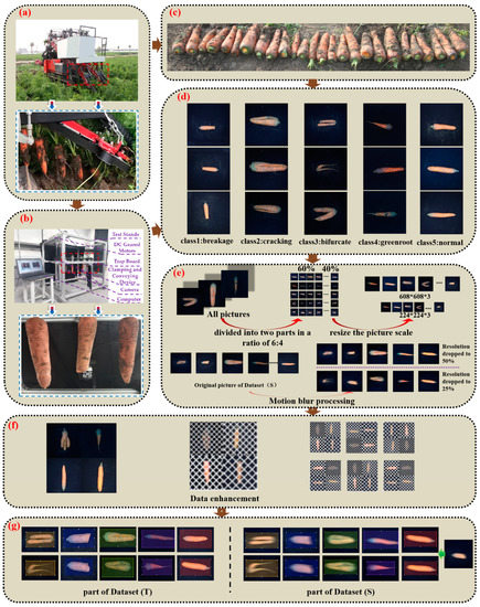 In order to effectively extract the complete carrot surface features, a group of samples was rotated 90° after shooting to obtain the images of two other sides. The images from four different sides were obtained after the second shooting. The collected carrot images were cleaned and corrected, and a total of 16,000 carrot images meeting the requirements were retained, with 3200 original images for each type of carrot. A portion of the images obtained are shown in Figure 3d [31]. Two datasets were needed in this study, so the pictures we shot were divided into 6:4 by category, namely Dataset (T) and Dataset (S) respectively. Because the vibration of the engine and hydraulic pump led to the corresponding vibration of carrots combine harvester during operation, and the field land is not smooth, it causes blurring of the acquired images. In order to solve this problem, 576 images of each type were randomly extracted from Dataset (S) for motion blurring treatment using python language programming, of which 300 images of each type were processed with resolution reduction of 2 times and 276 images were processed with resolution reduction of 4 times. Dataset (T) is not resolution degraded. The specific process is shown in Figure 3e. The images in Dataset (T) and Dataset (S) were marked and enhanced with data to meet the requirements of subsequent neural network training.