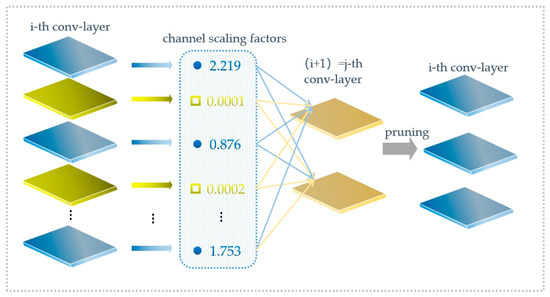 γ is the scaling factor, and when its value is close to 0, the activation value will also be close to 0. Therefore, the network pruning of channel dimension must remove the corresponding weight of the channel whose γ is close to 0. In this study, we set the global threshold at 80%. The mask of the BN layer is obtained according to the threshold. The network parameters and computation amount are reduced after the pruning operation. In the neck network, there exists the situation that two convolutional layers add together. We add them normally in order to align the improved network channels. Two convolutional layers need to be merged to complete the network reconstruction. In this study, the size of the improved student network becomes 1/5 of what it was before.