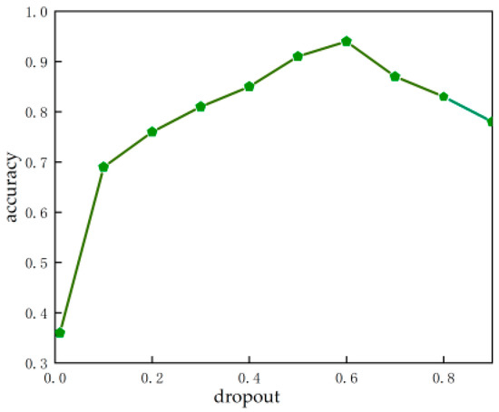 The dropout ratio represents the probability that the activation value of neurons in the network stops working, which can effectively avoid the model relying too much on some local features and improve the generalization ability of the model. The backbone structure of the S-mobile-slimv5s is mobilenetv2 [43], and the dropout ratio is added in the training. In this experiment, we studied the effect of different dropoust on model training in the optimal range of 0.01–0.9. Figure 6 shows the relationship between dropout and model accuracy [44]. From the figure, we can see that when the dropout increases from 0.01 to 0.6, the accuracy of the model also keeps increasing. From 0.6 onward, the accuracy slowly decreases as the dropout increases. When the dropout is too high, it means that too much neuron activity is suppressed, resulting in insufficient available features and reducing the accuracy of the model. The experiment indicates that suitable dropout can effectively suppress the overfitting of a model. In this study, the model shows the best performance when the dropout is 0.6.