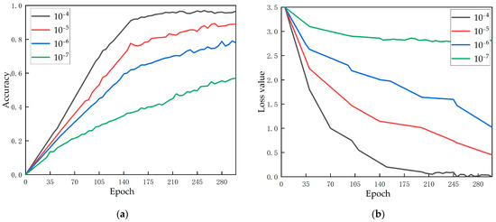The learning rate is used to adjust the weight of the network by controlling the step size of each iteration, so as to realize the hyperparameter of the optimal solution of loss function convergence. Figure 7 demonstrates the change of accuracy and loss value as the model training epoch lengthens under four different learning rates (). As can be seen from Figure 7a, when the learning rate is , the accuracy is the highest; when the learning rate is reduced to , the accuracy increases slowly, and the training effect is not good. Within this range, the training time for the model to achieve optimal results decreases with an increasing learning rate. Figure 7b shows the loss of function’s variation with the learning rate. When the learning rate is , the loss rate is relatively high. When the learning rate is , the loss rate is the smallest. In the range of to , the loss rate decreases with the increase of the learning rate. In this study, the model shows the best performance when the learning rate is .