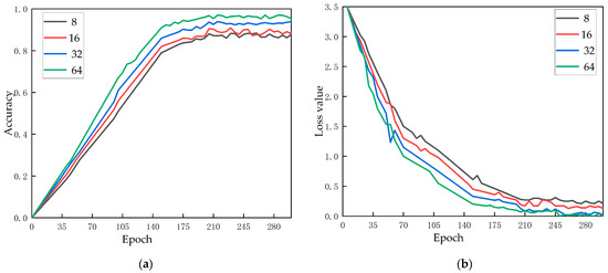 The batch size refers to the number of images trained in each batch during the training process, which determines the training speed and time of the model and is affected by the model size, image batch, and hardware equipment of network training. When the batch size is set too large, exceeding the acceptable range of the computer, it will cause a shortage of memory, resulting in the termination of training. If the batch size setting is too small, the convergence speed of the model will be too slow, and the training time will be extended. Therefore, within the acceptable range of computer performance, we set the batch size for the experiment from 8–64 for the experiment. The experimental results are shown in Figure 8. With the increase of batch size, the accuracy is obviously rising, and the loss rate is declining. Therefore, the batch size was set to 64 in this study.