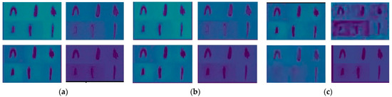 In order to observe the guiding effect of multi-stage knowledge distillation structure on the student network in Dataset (S) [45], output visualization of several network layers is carried out on the teacher network and the student network with/without teacher network supervision. The feature details for the visualization are shown in Figure 10. In this study, we set Dataset (T) as the input of the teacher network and Dataset (S) as the input of the student network. We could see that the outline of the target carrot in the feature map generated by the teacher network is clear and the noise is properly removed (Figure 10a). The student network has similar feature distribution under the guidance of the teacher network (Figure 10b). Figure 10c describes the student network that has not been supervised by the multi-stage features of the teacher network, so the feature map is quite different from that of the teacher network.