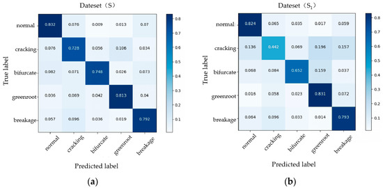 In order to verify the detection performance of network structure on different defect types of carrots, we tested four defect types in Dataset (S) and normal carrots [44]. Meanwhile, to fully verify the validity of this research, we carried out the same ratio of motion blurring treatment on the basis of Dataset (S) again to obtain Dataset (S1). The two datasets are compared, and the confusion matrix is shown in Figure 11. In the performance of Dataset (S), the accuracy of the algorithm in all defect types is higher than 70%, which meets the basic detection requirements. The detection effects on breakage and bifurcation are better, at 79.2% and 74.8%, respectively. The recognition accuracy of cracked, green root, and normal categories is 72.8%, 81.3%, and 83.2%, respectively. The cracking with defect features that are completely within the positive sample is the worst. In order to improve this error, we can increase the input proportion of cracking samples in the training set to improve the generalization ability of the network. The defect detection accuracy of Dataset (S1) with reduced resolution is 79.3% for breakage, 65.2% for bifurcation, 44.2% for cracking, 83.1% for green root, and 82.4% for normal. The distribution ratio is the same as that of Dataset (S).