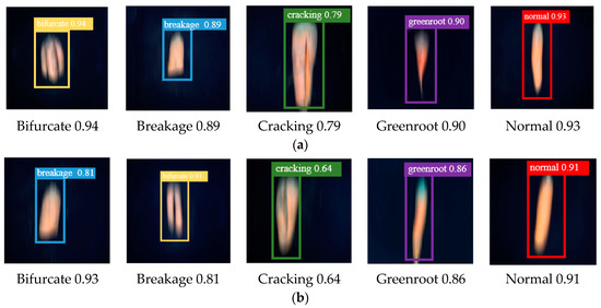 We present the test results of the model on two degraded datasets in Figure 12. The results show that our model has good detection performance. In the test phase, for several common carrot defect types, the student network can realize real-time detection without additional processing.