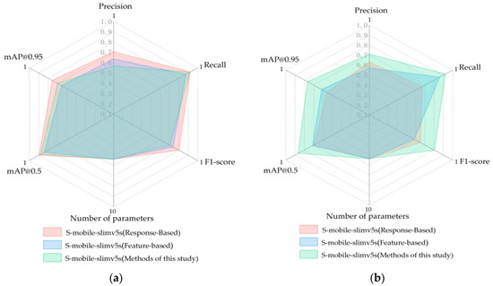 Table 5 shows the performance comparison of mobile-slimv5s under the two learning situations on Dataset (T), with or without teacher network supervision. Table 6 shows the performance comparison of mobile-slimv5s on Dataset (S) with/without teacher network supervision. The yolo-v5s and the improved student network mobile-slimv5s are trained on Dataset (T) and Dataset (S) datasets, respectively. Other settings, parameters, and test sets are the same. In the high-resolution dataset, mAP@0.50 of yolo-v5s is 90.9%, mAP@0.50 of the supervised S-mobile-slimv5s network is 88.1%, and mAP@0.50 of the unsupervised mobile-slimv5s network is 76.2%, which presents an obvious decreasing relationship (Table 5). In terms of the training on Dataset (S), the performance of supervised learning is obviously better than that of unsupervised learning. Meanwhile, compared with the performance on Dataset (T), the gap between T-Yolov5s and S-mobile-slimv5s is much smaller (Table 6), which indicates that the knowledge distillation network constructed in this study is effective in identifying carrot images with motion blurring features. Under the guidance of yolo-v5s, mobile-slimv5s can well learn key features from resolution-degraded datasets, which is related to multi-stage feature extraction.