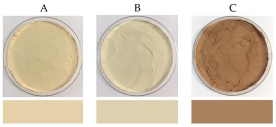 The colour values and images of PPI, SPI and EverPro are shown in Table 3 and Figure 2, respectively. The L*a*b* colour values for PPI and SPI are relatively similar, with PPI having a slightly higher a* value, indicating an increased red tone. The b* values were also similar, ranging from 18.5 ± 0.13 for SPI to 24.98 ± 0.80 for EverPro. The EverPro sample has a much darker colour, having a statistically significant lower L* value of 57.4 compared to 84.7 and 83.8 for PPI and SPI, respectively, which do not differ significantly.