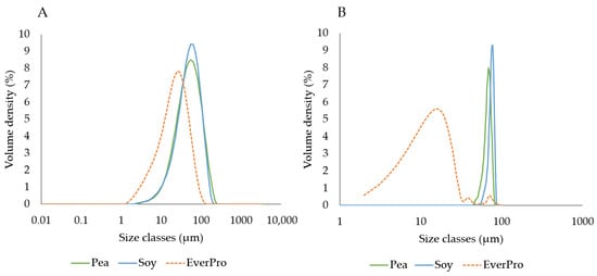 The dry (A) and wet (B) particle size dispersion for pea, soy and EverPro, displayed as volume density (%) per size class (μm).