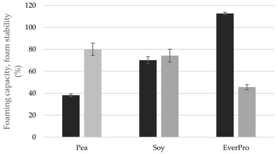 The foaming capacity (black bars) and foam stability (grey bars) of pea, soy and EverPro.