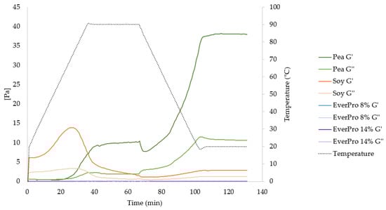 Rheological profiles of pea, soy and EverPro over a heating and cooling cycle, represented by the storage modulus (G’) and the loss modulus (G”).