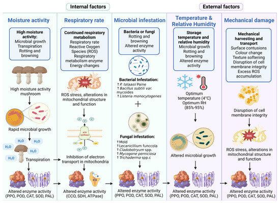 Factors influencing postharvest spoilage of edible mushrooms. (PPO: polyphenol oxidase; POD: peroxidase; CAT: catalase; SOD: superoxide dismutase; PAL: L-phenylalanine ammonia-lyase; CCO: cytochrome C oxidase; SDH: succinate dehydrogenase; ROS: reactive oxygen species.) Created with BioRender.com.