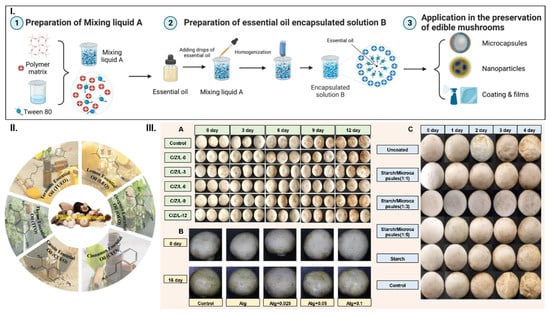 Forms of essential oils applied to the preservation of edible mushrooms ((I) Schematic diagram of the formation of an essential oil slow-release system and its application form in the preservation of edible mushrooms; (II) the main components of essential oils used to preserve edible mushrooms; (III) changes in edible mushroom quality after essential oil treatment. (A) Agaricus bisporus after chitosan/zeaxolysin/lemon essential oil composite film treatment [70]; (B) Agaricus bisporus after treatment with cinnamon essential oil [84]; (C) Agaricus bisporus after starch/cinnamon essential oil composite film treatment [85]. Copyright 2021, Elsevier.) Figure 2A created with BioRender.com.