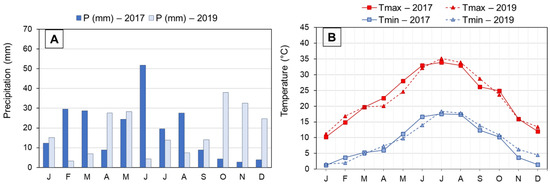 Monthly precipitation (A) and monthly air temperatures (maximum and minimum) (B) registered in Alcañiz (Teruel) during 2017 and 2019 crop seasons. Abbreviations: P, precipitations; Tmax, average maximum temperatures; Tmin, average minimum temperatures. J, January; F, February; M, March; A, April; M, May; J, June; J, July; A, August; S, September; O, October; N, November; D, December.