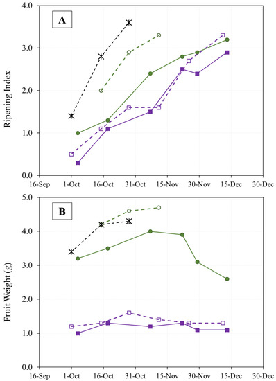 Evolution of olive fruit ripening (A) and fruit weight (B) of “Arbequina” (square; violet), “Royal de Calatayud” (circle; green), and “Negral de Sabiñán” (cross; black) harvested at different dates in 2017 (continuous line) and 2019 (dotted line).