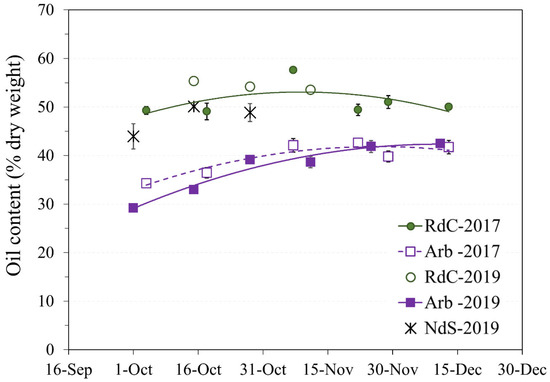 The “Arbequina” cultivar showed a higher accumulation rate during the 2019 harvest, although the curves in the two crop years were similar. Oil content in dry matter (approximately 42%) in “Arbequina” was lower than in the two autochthonous cultivars. Other authors [18,19] have described a similar content ratio in “Arbequina”. The summer of 2019 was drier, and the autumn considerably wetter (Figure 1). This could explain the differences observed in “Arbequina” olives of similar maturity (Figure 2A) in terms of the evolution of their oil contents over the two years [20,21]. The oil content of the “Royal de Calatayud” cultivar was higher in both seasons compared to “Arbequina”. The oil content reached by the “Royal de Calatayud” cultivar by the end of the 2017 sampling was 50.5%, thus 8 percentage points higher than in “Arbequina” in the same harvest. The “Negral de Sabiñán” cultivar presented a high oil content (43.9%) at the beginning of October 2019, similar to the “Royal de Calatayud” cultivar on the exact same sampling dates. Thus, “Royal de Calatayud” and “Negral de Sabiñán” displayed high yields, which were higher than “Arbequina” in both cases.