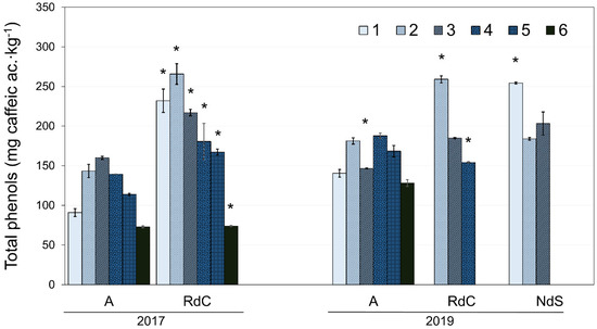 Evolution of polyphenol content for “Arbequina” (A), “Royal de Calatayud” (RdC), and “Negral de Sabiñán” (NdS) olive oils in 2017 and 2019 crop years. Harvest dates: 1 (1–4 October), 2 (16–18 October), 3 (28 October–7 November), 4 (11–22 November), 5 (25–29 November), and 6 (11–13 December). *, significant statistical differences (p < 0.05) among cultivars for the same crop year.