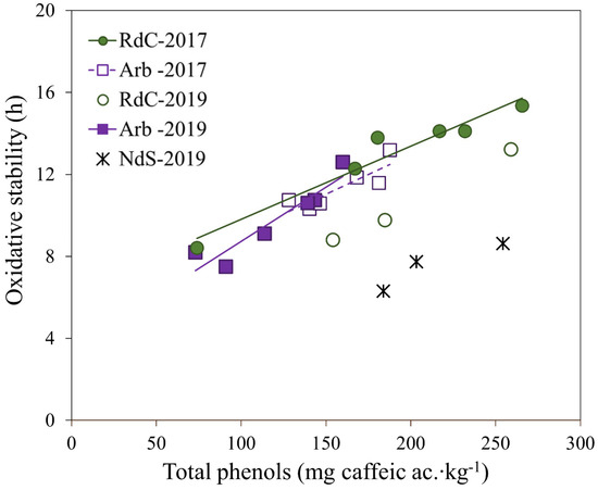 Linear regression of oxidative stability vs. total polyphenol content for “Arbequina” (Arb; square; violet), “Royal de Calatayud” (RdC; circle; green), and “Negral de Sabiñán” (NdS; cross; black) olive oil samples obtained in 2017 (solid marker) and 2019 (unfilled marker) crop years.