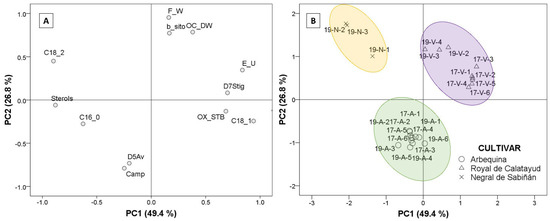 Factor analysis extraction by Principal Component Analysis (PCA) was used to identify which of the parameters analyzed explains the differences among the oils from the three cultivars. Using Kaiser’s rule (values higher than 1), the PCA model selected three principal components that explained 88.4% of the total variance, according to the twelve studied parameters. Only the first two PCs were represented (Figure 6). The selected agronomic parameters were fresh fruit weight and oil content (% dry olive paste weight). The selected parameters in oil were principal fatty acids, such as palmitic, oleic, and linoleic acid, in addition to total sterol content, campesterol, β-sitosterol, Δ5-avenasterol, Δ7- stigmastenol, triterpenic dialcohols, and oxidative stability. Figure 6A explains the loadings corresponding to the extracted components (PC1 and PC2) according to the selected parameter. The regression method was applied to obtain the first two factor scores, which were saved as variables and subsequently represented to generate biplot (Figure 6B) via a scatter plot, labeling the cases by cultivar.