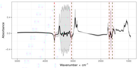 Figure 1. Mean absorbance values (dark solid line) and the 0.025 and 0.975 quantiles (gray lines) of the 1060 individual infrared wavelengths (5000 to 930 × cm−1), measured from 1314 spectra of milk samples from 657 goats. Red dashed lines indicate regions with high variability.