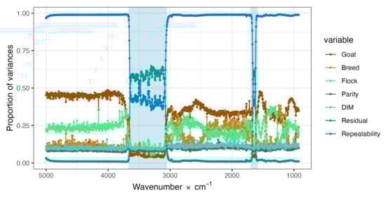 No studies in the literature that analyze the major sources of variation in the absorbance of electromagnetic radiation at the level of individual wavenumbers or spectral regions for milk was found, but there are some studies, described later, that quantified the genetic and environmental components of the phenotype. As seen here, both components are much greater in the regions with a very large phenotypic variability (“water” regions) than in the rest of the spectrum [41]. In this case, too, it might be more informative to analyze the relative proportions of the genetic and environmental variance components, which are expressed as the heritability of absorbance. It is worth noting that our previous studies, among others, found heritabilities, albeit variable, for several wavenumbers also in the “water” regions [42,44]. Obviously, the genetic variance represents the major part of the variation due to the breed and a part of that due to the individual animal. The herd–year–season component has also been found to have a strong influence on the phenotypic variance of absorbance in bovine milk [44], and to affect the prediction of milk traits from FTIR caprine milk spectra [60]. Interactions between the cow’s genetics, parity, and stage of lactation and spectral region have also been found [44].