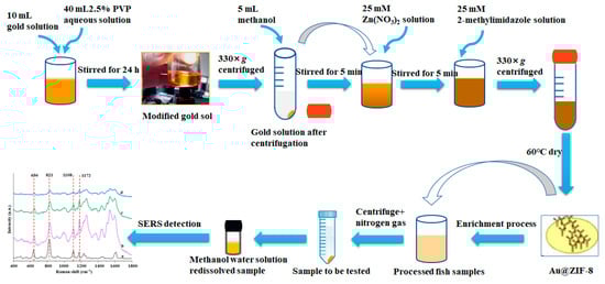 Surface-enhanced Raman spectroscopy (SERS) introduced nanotechnology based on ordinary Raman scattering using precious metal nanomaterials as the substrate to enhance the Raman scattering of analytes, thus possessing significant advantages such as high sensitivity and fast screening speed [20]. However, the target molecules often unevenly spread across the substrate, leading to the poor reproducibility of the SERS signals [21]. Moreover, some components contained in the food samples would also adsorb onto the substrate and interfere with the analysis of the target molecules, which limits its further application in the field of food detection [22]. SERS has great application potential in food safety-related detection fields. SERS is widely used to rapidly detect food-borne pathogens, mycotoxins, shellfish toxins, illegal food additives, drug residues, and other toxic and harmful substances in food [23]. Therefore, it is an encouraging attempt to apply ZIF-8 materials together with SERS detection technology in food detection, which can not only increase the application scenes of MOF materials, but also enrich the substrate types of SERS technology [24]. The combined application of MOFs materials and SERS technology is mainly manifested in two aspects. On the one hand, MOFs materials are used in the pretreatment of the SERS detection, and on the other hand, MOFs materials are used in the synthesis of the SERS substrate [25]. The combined application of the two materials has been used in food detection [26].
