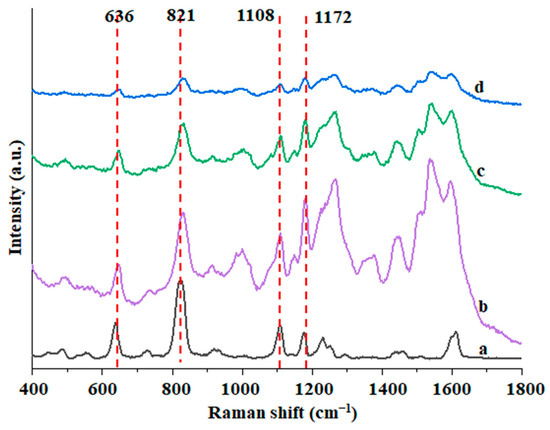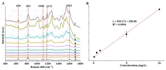 SERS detection was carried out on different concentrations of BPA by the optimal detection method of Au@ZIF-8. Figure 6 showed the Raman peaks at 636, 821, 1108, 1172, and 1612 cm−1 that were used to determine the minimum detection limit, because these Raman peaks were greatly enhanced. Among them, 636 cm−1 is a skeleton vibration of para-substituted benzene, 821 cm−1 is a vibration of para-substituted benzene, 1108 cm−1 is a C=C stretching vibration, and 1172 cm−1 is a vibration of para-substituted benzene [39]. As can be seen in Figure 6A, with the gradual decrease in the concentration of BPA solution, the SERS signal intensity of the five characteristic Raman peaks all decreased. When the concentration was 0.1 mg/L, the five Raman peaks could be clearly identified. When the concentration continued to decrease to 0.05 mg/L, the five Raman peaks could not be identified (the curve represented by c in Figure 6A). The possible reason may be that the concentration of BPA is already deficient. The Raman spectrum information of a tiny amount of BPA cannot be captured and enhanced by the Au@ZIF-8 material [31]. Therefore, the detection limit of this method is 0.1 mg/L. When the concentration of BPA was in the range of 0.1~10 mg/L, there was a good linear relationship between the peak intensity at 1172 cm−1 and the solution concentration, and the R2 could reach 0.9954 (Figure 6B).
