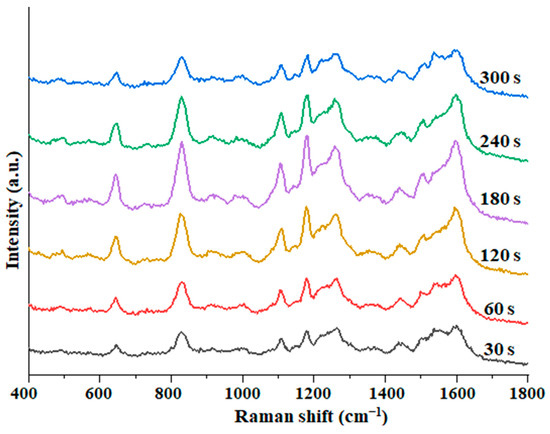 Mixing time. As can be seen from Figure 4, the SERS intensity of BPA increased with the mixing time from 30 to 180 s. The SERS intensity continued to decrease when the time exceeded 180 s. On the other hand, it could be that at the beginning, as time goes on, the BPA molecules in the solution continue to be adsorbed. At the same time, as the solvent volatilizes, more and more BPA molecules come into contact with the substrate, and the number of BPA molecules adsorbed per unit substrate increases, and the SERS signal also becomes stronger [32]. When the solvent evaporates to a certain degree, it will form “dry patches”, the system is in a state of excessive accumulation, and the SERS intensity is also weakened [24]. So, the mixing detection time was selected as 180 s.