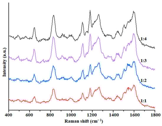 Different ratio of solution. The ratio of solution and substrate can also influence the SERS effect [38], which was optimized; the results are shown in Figure 5. As can be seen, when the solution was mixed with the Au@ZIF-8 suspension at a ratio of 1:3, the SERS enhanced effect was the best and relatively ideal and has a smaller amount of substrate used compared with 1:4. Therefore, the mixing ratio was fixed as 1:3 in the subsequent experiments.