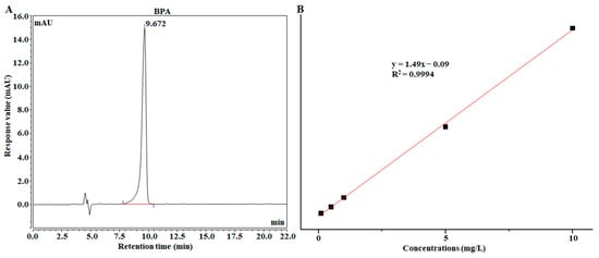 (A) HPLC detection results of BPA; (B) Standard curve between peak area and concentration in the range of 0.1–10 mg / L.