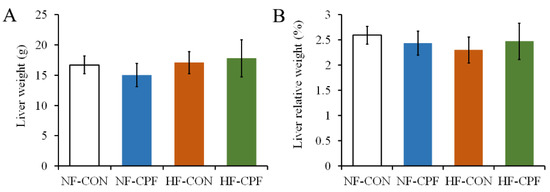 Effects of CPF on liver weight (A) and relative weight (to the whole bodyweight, (B)) of rats treated with 3.0 mg/kg b.w. CPF under the NF diet and HF diet. CPF—Chlorpyrifos. NF-CON—fed a normal-fat diet and vehicle. NF-CPF—fed a normal-fat diet and chlorpyrifos. HF-CON—fed a high-fat diet and vehicle. HF-CPF—fed high-fat diet and chlorpyrifos.