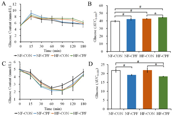 Interestingly, within 180 min of oral glucose administration, the area below the blood glucose line in the NF-CPF treated group was significantly higher than in the NF-CON group (Figure 2B, p < 0.05). The HF diet also led to a higher area below the blood glucose line than the NF diet. Additionally, the area in the HF-CPF group was promoted compared with HF-CON and HF-CPF. Thus, CPF treatment paired with an HF diet aggravated glucose intolerance in rats.