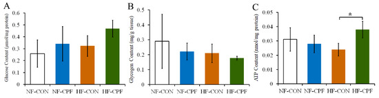 Effects of CPF on liver glucose metabolism of rats under NF diet and HF diet. (A) Glucose content. (B) Glycogen content. (C) ATP content. CPF—Chlorpyrifos. ATP—Adenosine triphosphate. NF-CON—fed a normal-fat diet and vehicle. NF-CPF—fed a normal-fat diet and chlorpyrifos. HF-CON—fed a high-fat diet and vehicle. HF-CPF—fed a high-fat diet and chlorpyrifos. The symbol * indicates a significant difference between the covered groups at p < 0.05.
