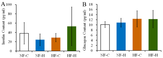Effects of CPF on serum contents of insulin (A) and glucagon (B) in rats treated under the NF diet and HF diet. CPF—Chlorpyrifos. NF-CON—fed a normal-fat diet and vehicle. NF-CPF—fed a normal-fat diet and chlorpyrifos. HF-CON—fed a high-fat diet and vehicle. HF-CPF—fed a high-fat diet and chlorpyrifos. There are no significant differences between all of the experimental groups at p < 0.05.