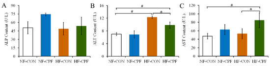 Effects of CPF on liver function of the rat under the NF diet and HF diet. (A) ALP content. (B) ALT content. (C) AST content. CPF—Chlorpyrifos. NF-CON—fed a normal-fat diet and vehicle. NF-CPF—fed a normal-fat diet and chlorpyrifos. HF-CON—fed a high-fat diet and vehicle. HF-CPF—fed a high-fat diet and chlorpyrifos. The symbol * and # indicates a significant difference between the covered groups at p < 0.05.
