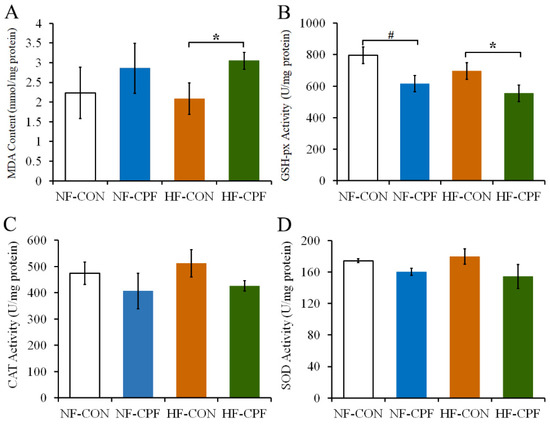 Effects of CPF on the antioxidant system of the liver. (A) MDA content. (B) GSH-px activity. (C) CAT activity. (D) SOD activity. CPF—Chlorpyrifos. NF-CON—fed a normal-fat diet and vehicle. NF-CPF—fed a normal-fat diet and chlorpyrifos. HF-CON—fed a high-fat diet and vehicle. HF-CPF—fed a high-fat diet and chlorpyrifos. The symbol * and # indicates a significant difference between the covered groups at p < 0.05.