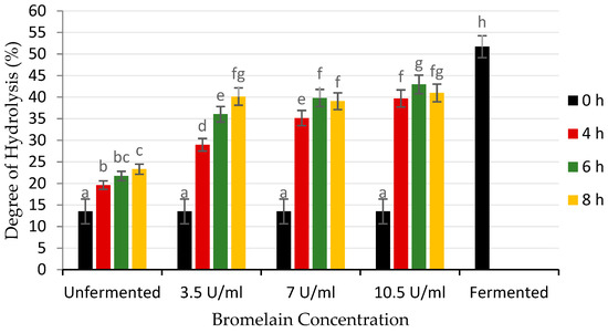 Degree of hydrolysis (%) of unfermented cocoa beans hydrolyzed by bromelain. Unfermented and fermented cocoa beans were used as a control. a–g Non-capital letters represent the statistical differences in the interaction of enzyme concentration and hydrolysis time (p < 0.05).