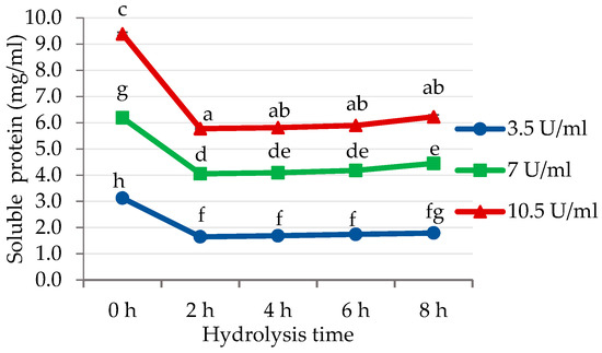 Soluble protein in the buffer–enzyme solution during hydrolysis with bromelain. a–h non-capital letters represent the statistical differences (p < 0.05).