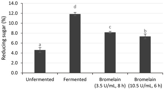 Reducing sugar of unfermented cocoa beans hydrolyzed by bromelain. Unfermented and fermented cocoa beans were used as controls. a–d Indicates the significant difference (p < 0.05).