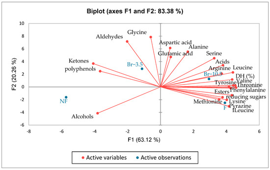 Principal component analysis (PCA) biplot for correlations between parameters of the degree of hydrolysis, free amino acids, reducing sugars, polyphenols, free amino acids, and volatile compounds with different treatments of unfermented cocoa beans: NF = unfermented cocoa beans; Br−3.5 = bromelain concentrations of 3.5 U/mL for 8 h; Br−10.5 = bromelain concentrations of 10.5 U/mL for 6 h; F = fermented cocoa beans.