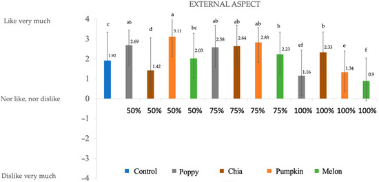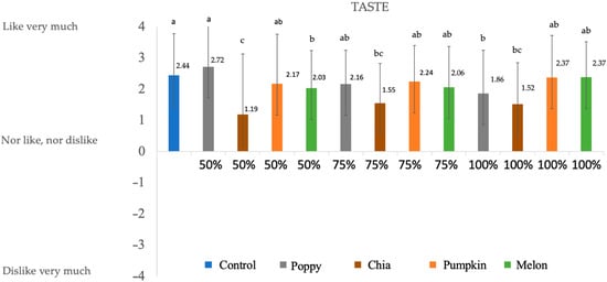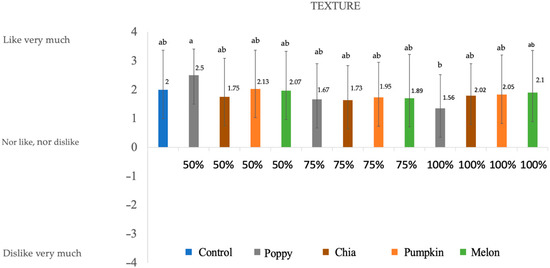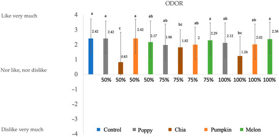 No significant differences were found for odor (p < 0.5) among the control sample, poppy 50%, pumpkin 50%, melon 75%, and melon 1000%. For the rest of the samples, scores are above 0, and in most of the cases (melon 50%, pumpkin 75%, poppy 100%, and pumpkin 100%) were valued as ‘I like a lot’. A study carried out on fermented sausages did not show big differences among samples for odor when adding olive oil in the reformulation [46]. On the other hand, the worst valued was chia 50%, followed by chia 75% and chia 100%, which may be due to the large quantities of Omega-3 present in the oil, which produces a fishy odor when heated.