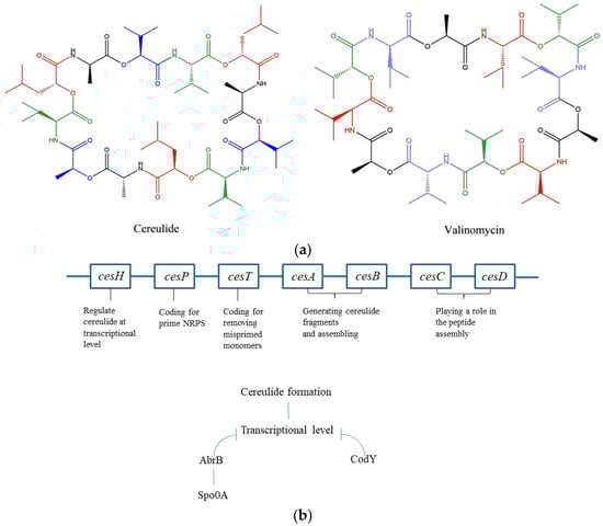 Cereulide is an emetic B. cereus product with the structure of a cyclic and lipophilic dodecadepsipeptide containing three repetitions of four amino acids, D-Oxy-Leu—D-Ala—L-Oxy-Val—L-Val, which resembles valinomycin, a well-known antibiotic formed by Streptomyces with the sequence D-Oxy-Hyi—D-Val—L-Oxy-Lac—L-Val (Figure 1a) [54]. In natural niches, cereulide has a potassium-scavenging ability in potassium-poor environments, which provides an adaptive advantage to emetic strains [55,56,57]. It also plays a role in antifungal activity by protecting the mutualistic plant tuber against fungal attraction [58]. The biosynthesis of cereulide is directed by the non-ribosomal peptide synthetase (NRPS) encoded in the ces gene clusters, including the cesA, B, C, D, H, P and T genes, located on a 270 kb megaplasmid known as pCER270 (or pCERE01) (Figure 1b) [59]. The cesA and cesB genes are responsible for generating the D-Oxy-Leu—D-Ala and L-Oxy-Val—L-Val fragments, respectively, and assembling the two monomers in the peptide chain [60]; the cesP gene encodes a 4′-phosphopantetheinyl transferase, which primes the NRPS; the cesT gene codes for a putative type II thioesterase, which eliminates misprimed monomers; the cesC and cesD genes encode for a putative ABC transporter, which is a vital component that acts to restrict the cesA and B synthase to the cell membrane, playing an important role in peptide assembly [61]; and cesH regulates cereulide formation at the transcriptional level [35]. In addition to cesH, NRPS cereulide synthesis is also controlled by the AbrB, Spo0A and CodY regulators at the transcriptional level (Figure 1b) [62]. Spo0A inhibits AbrB transcription under low phosphorylation levels, which promotes cereulide formation [62,63]. CodY inhibits cereulide production, as shown in a CodY deletion mutation study where mutated B. cereus displayed an upregulation of cesA and cesB mRNA levels with 60- and 34-fold enhancement, respectively [64].